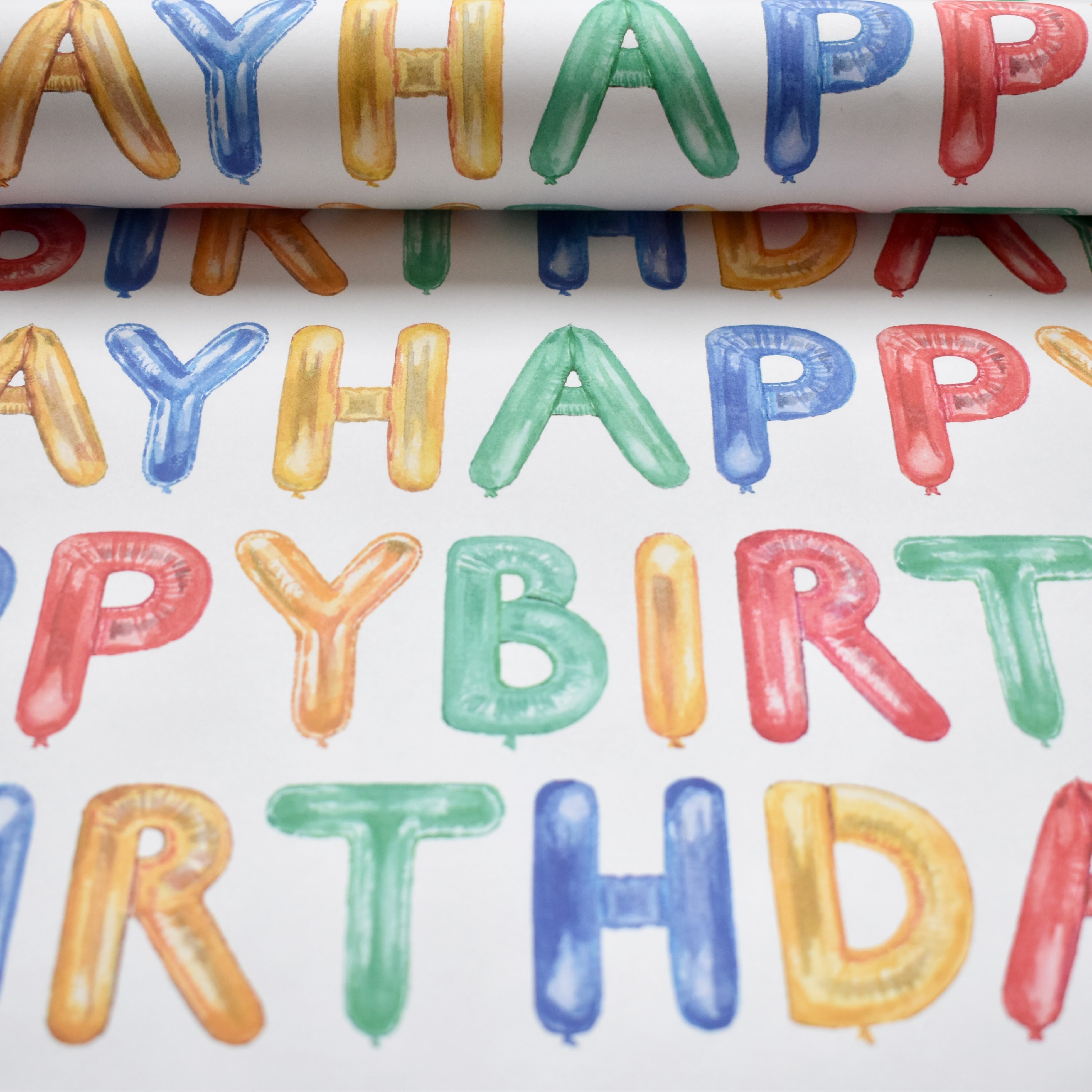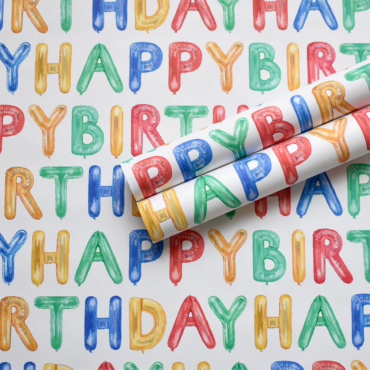 Watercolor party balloons spell "Happy Birthday" in this festive gift wrap. Printed on fine yet pliable matte paper, each roll promises to elevate your gifting on the birthday party circuit.