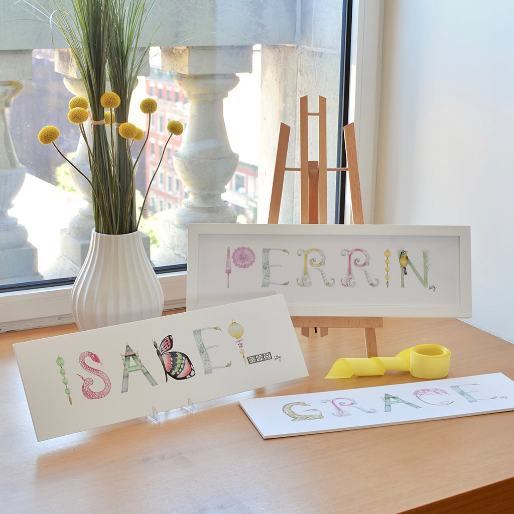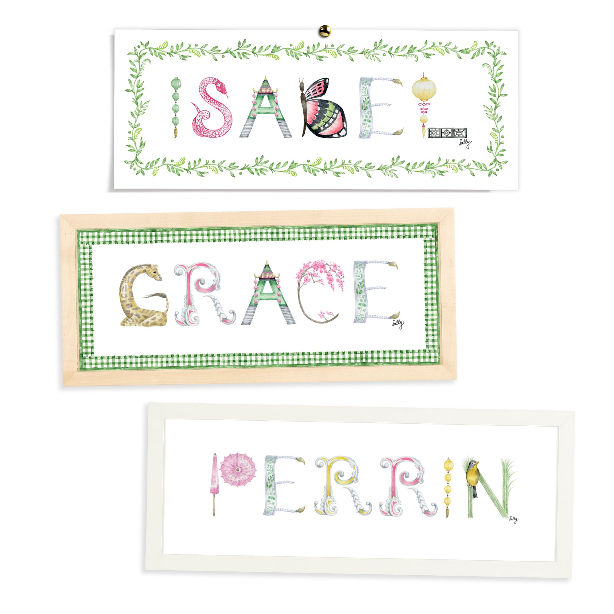 Printed-to-order on white matte paper, based on Sally’s original watercolors. Unframed Name Prints measure 6.5" H with varying width depending on length of name. Frame adds ~1" in both directions.