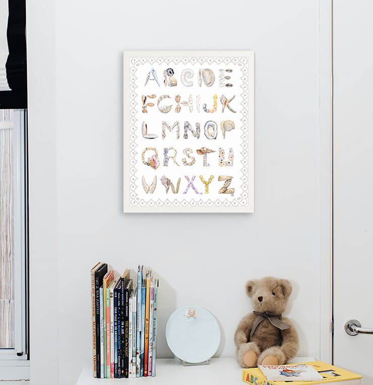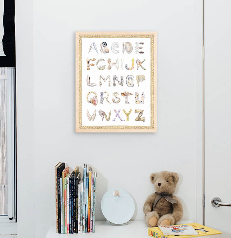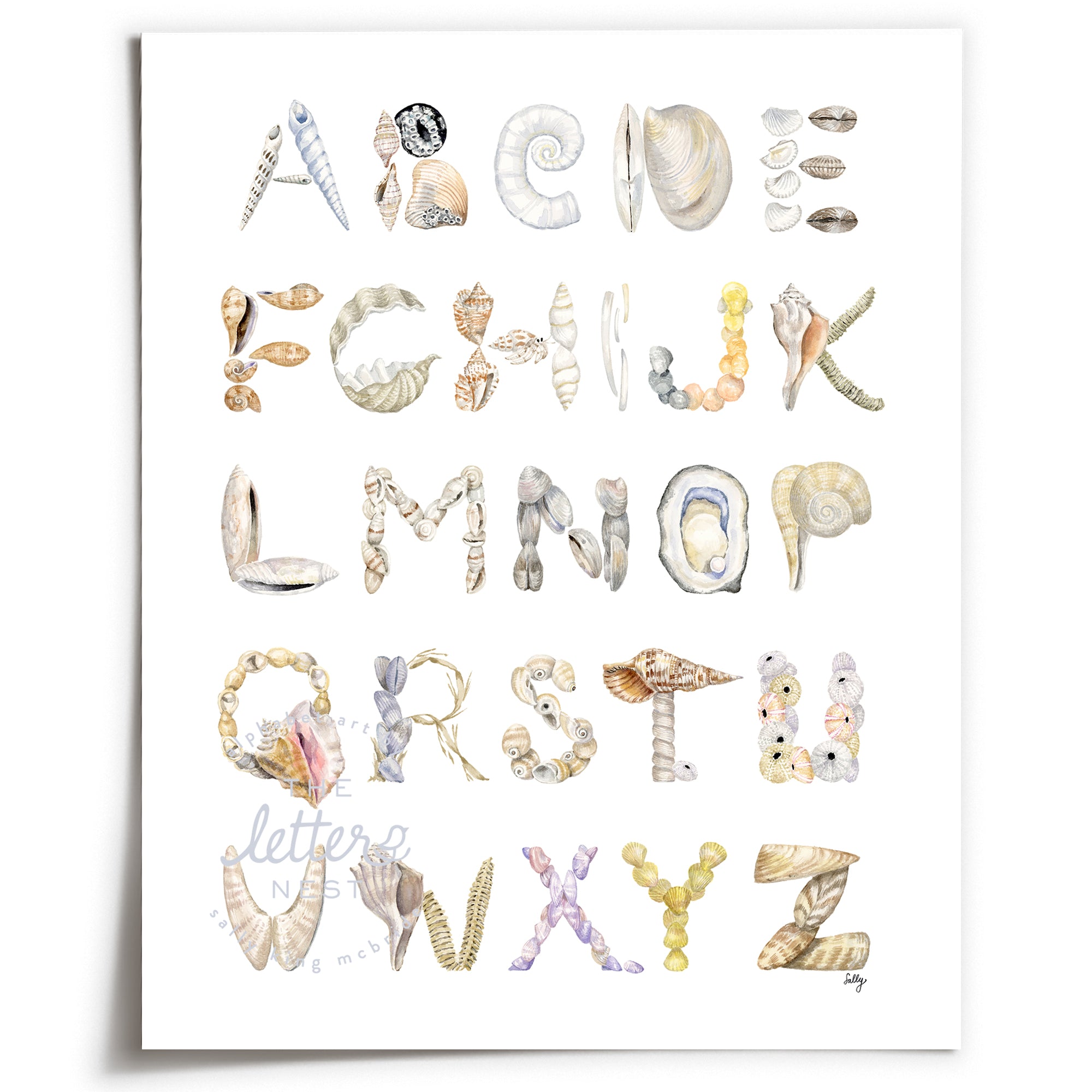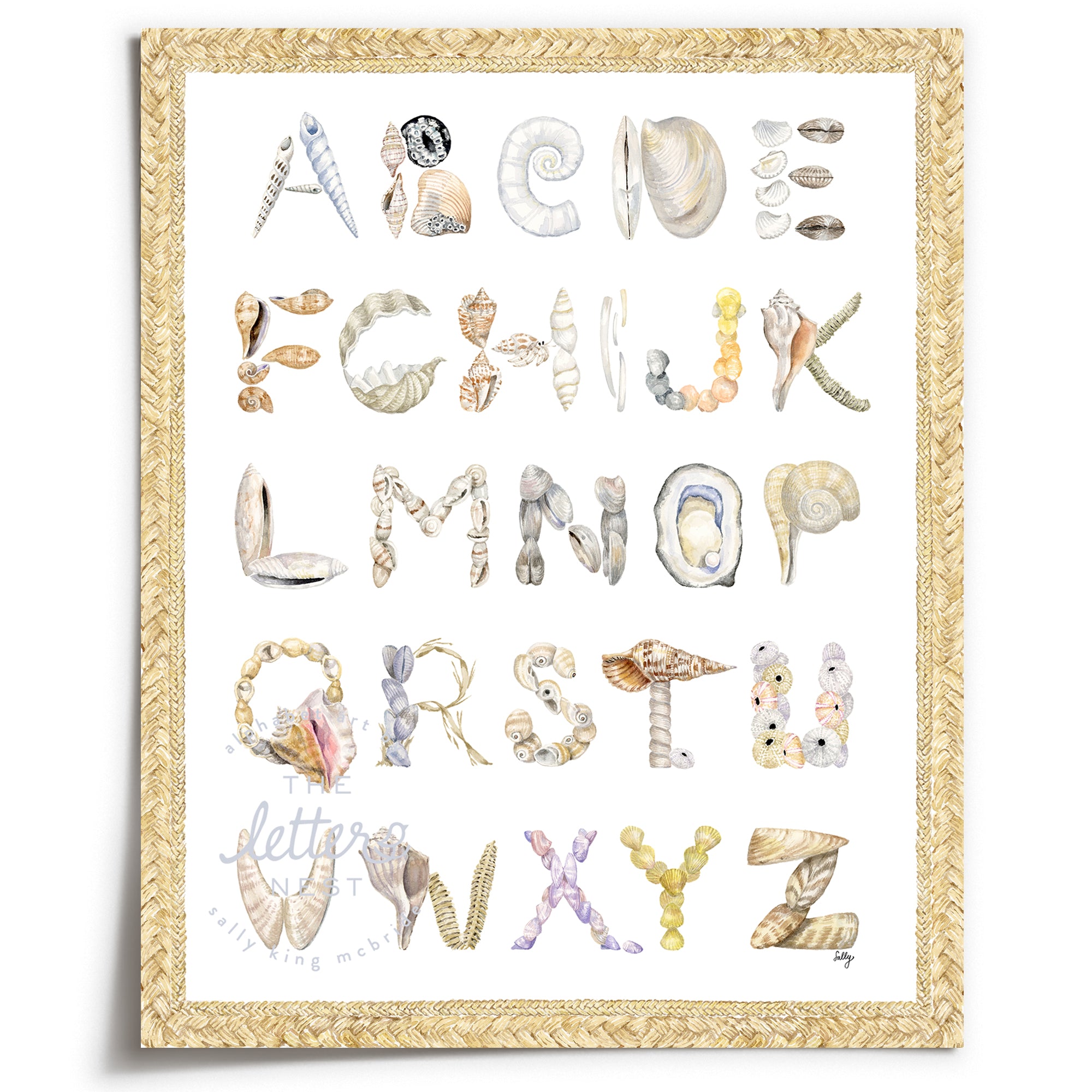 Meet the Shell Alphabet, featuring 26 letters sourced from the beach, from Auger Shell to Zebra Mussels. Add an optional watercolor border to your print, including Scallop & Shell, or Braided Rope.