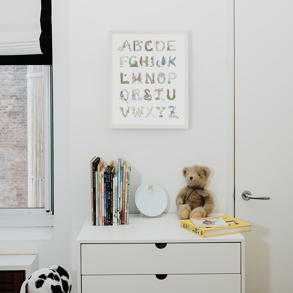 The Woodland Alphabet features letters from the natural world in a delicate palette. From Acorn to Zebra Moth, the Alphabet brings the outdoors in. As seen in Frederic Magazine.