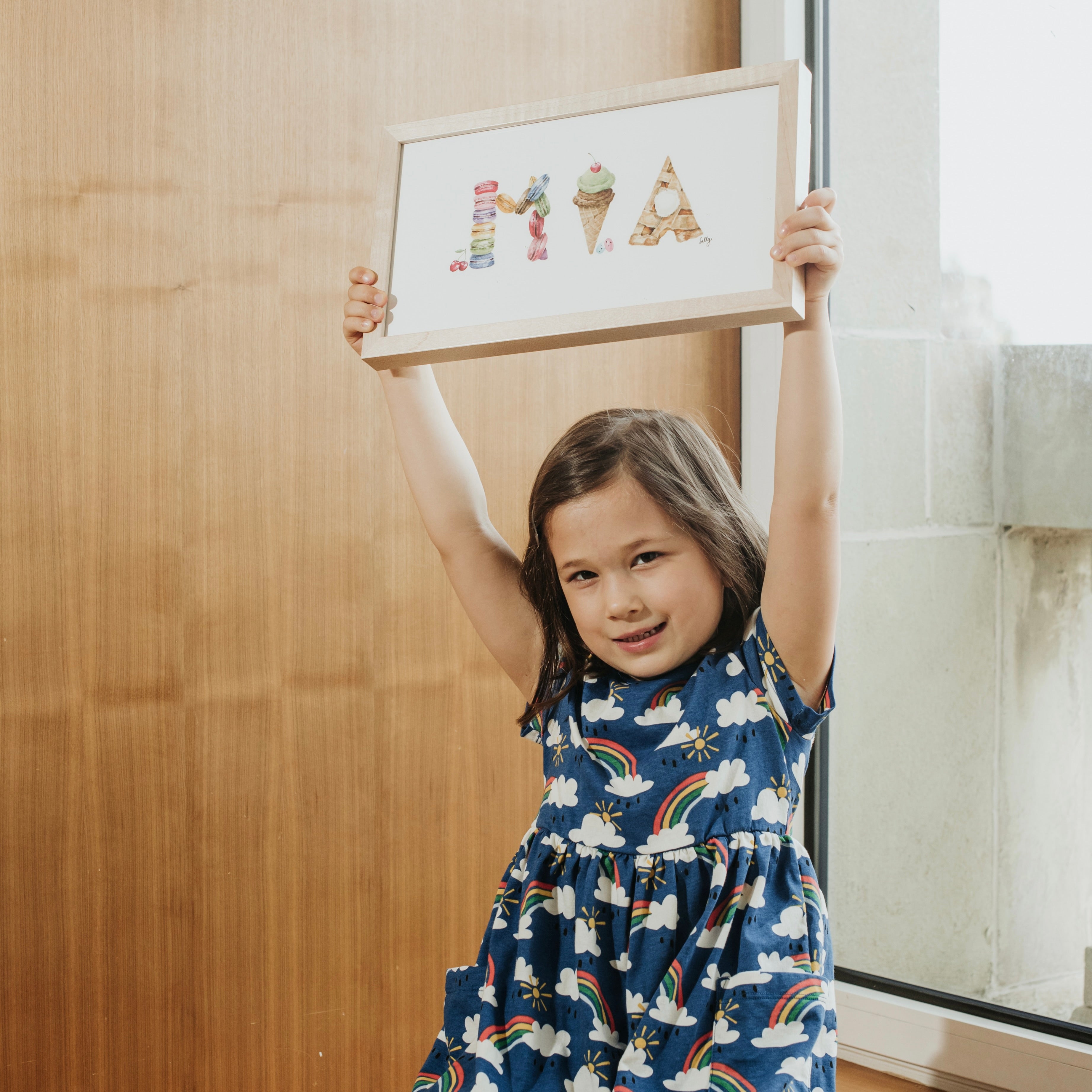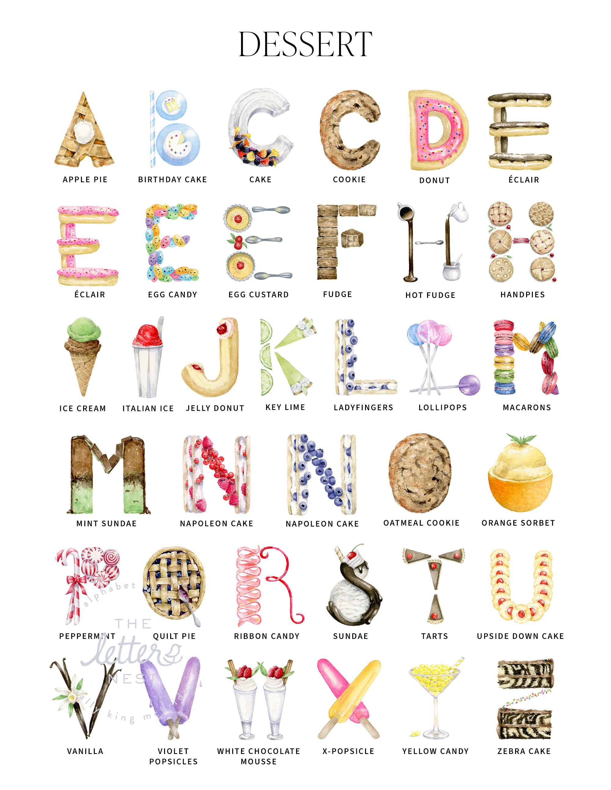 Personalize The Letter Nest’s Dessert Alphabet with a Custom Name Print for your nursery, playroom, or kid’s room. You provide the name, and Sally will customize the artwork for you.