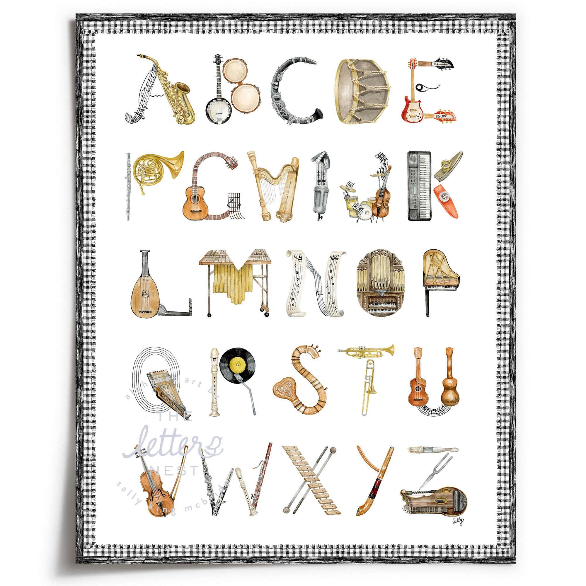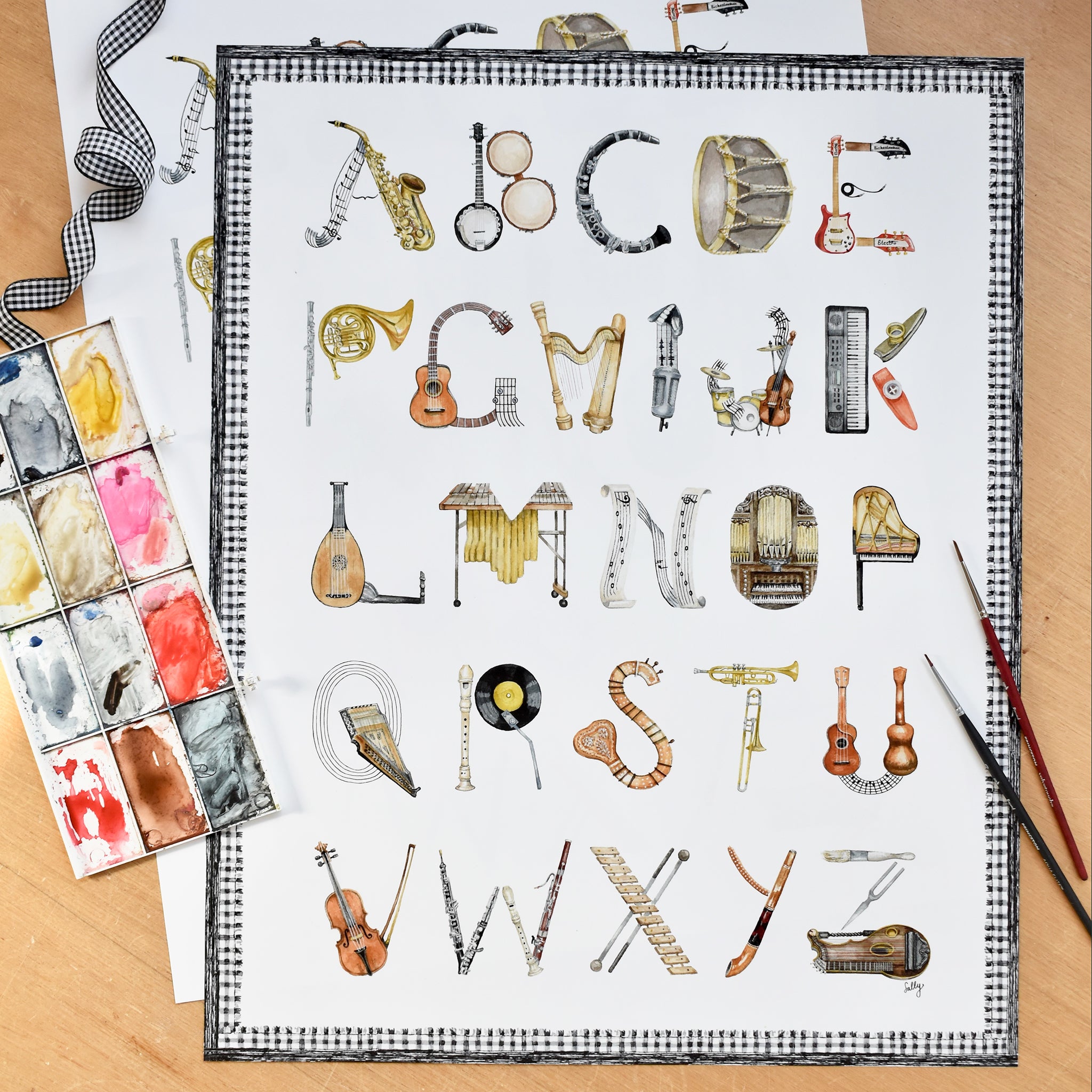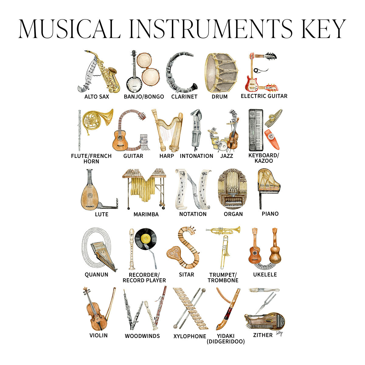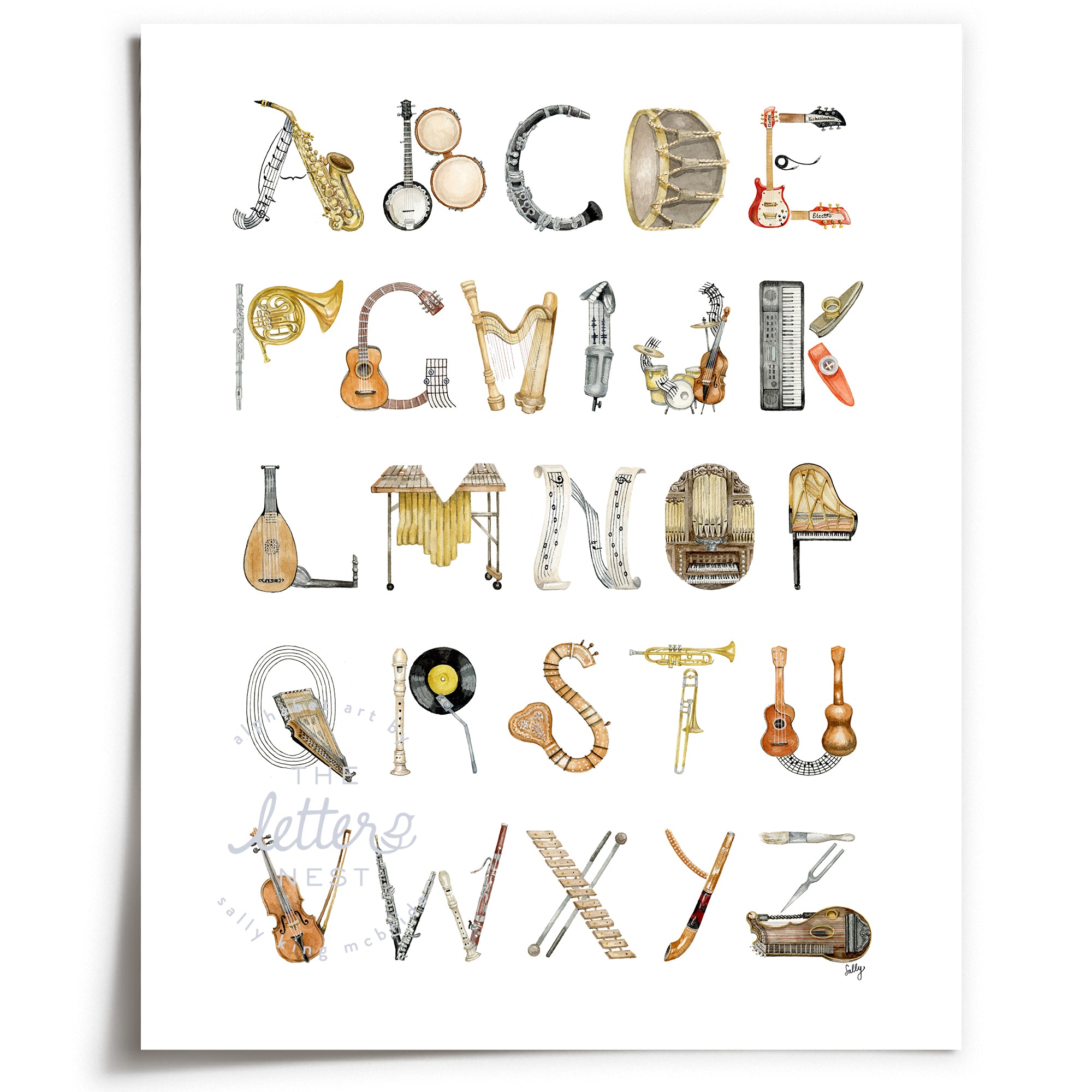 Instruments from Alto Sax to Zither comprise this watercolor alphabet, introducing the music of the world to your littlest learner.