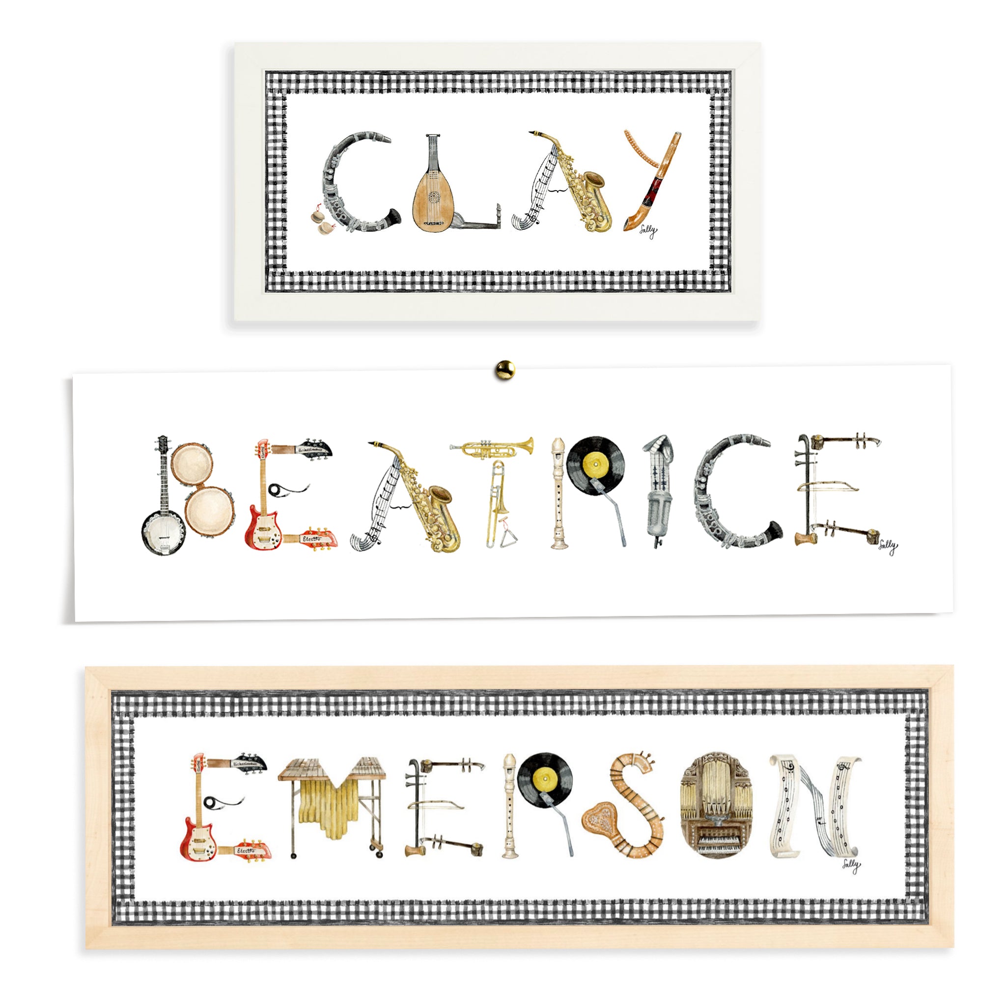 Spell your name in Musical Instruments with a Custom Name Print for your nursery, playroom, or kid’s room. You provide the name, and Sally will customize the artwork for you.