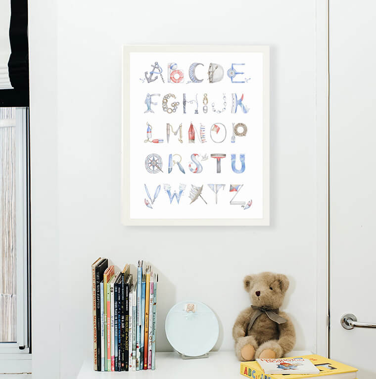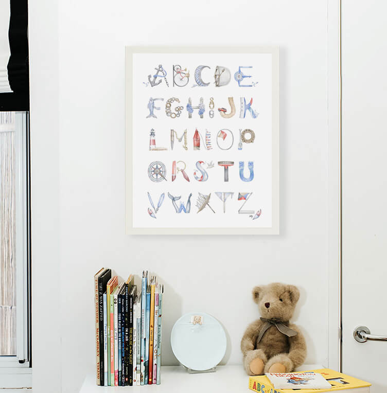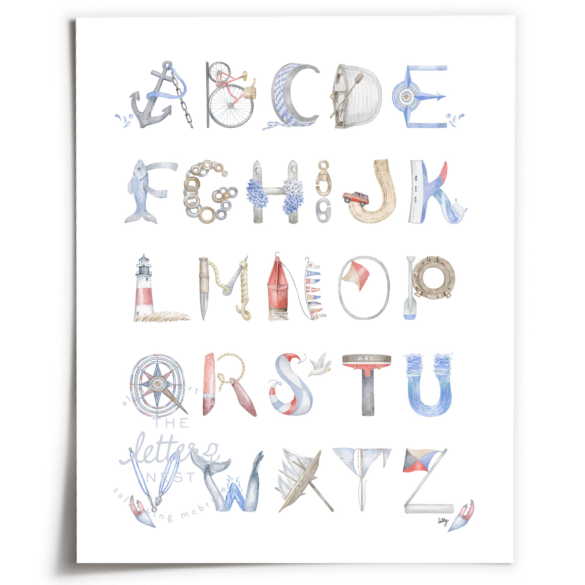 The Nautical Alphabet: A for Anchor, B for Buoy, C for Cable, in a light and coastal palette.