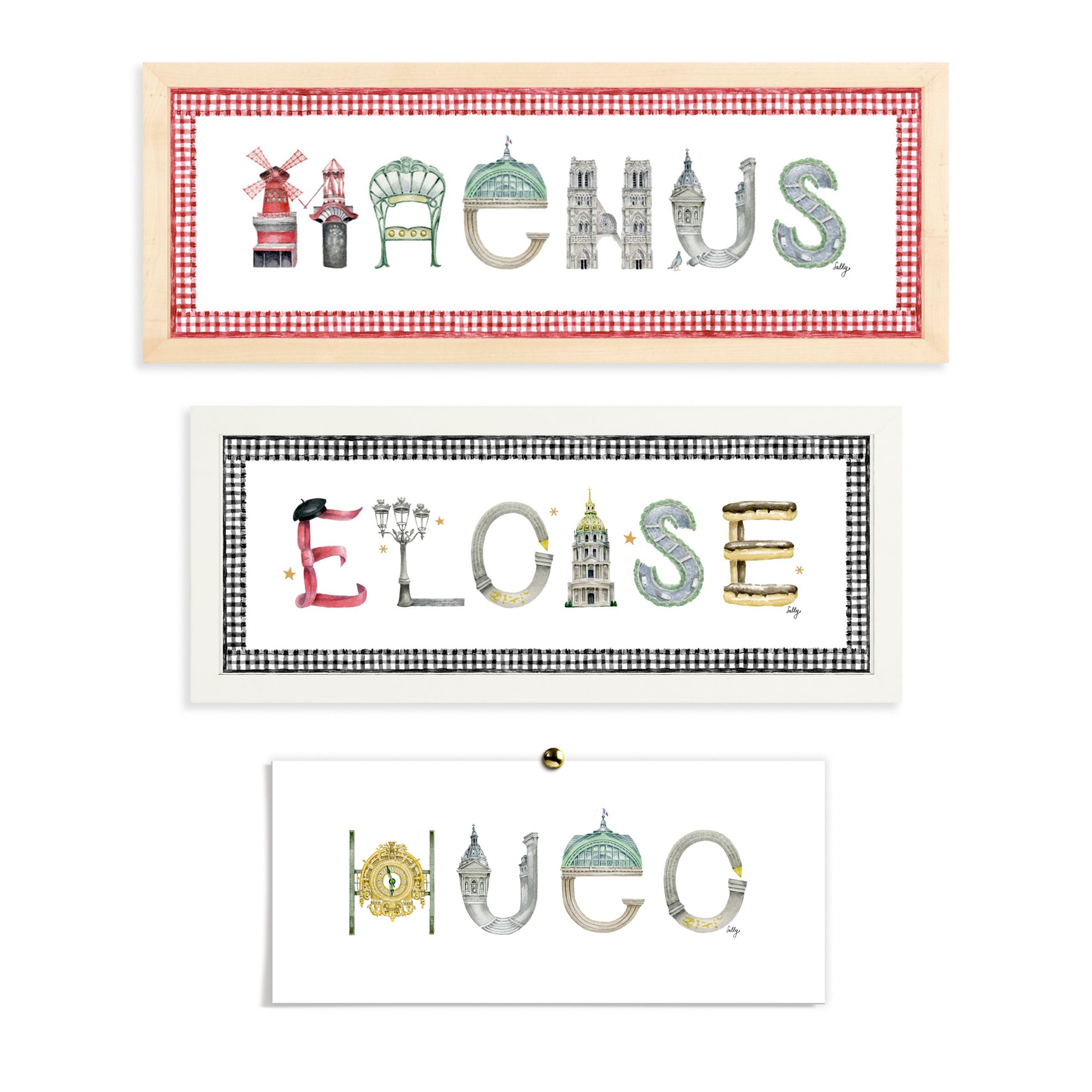 Spell your name in french-language letters from The Letter Nest’s Paris Alphabet, from "A" for Art Nouveau to "T" for Tour Eiffel, bringing Parisian charm to your nursery, playroom, or kid’s room. You provide the name, and Sally will customize the artwork for you.