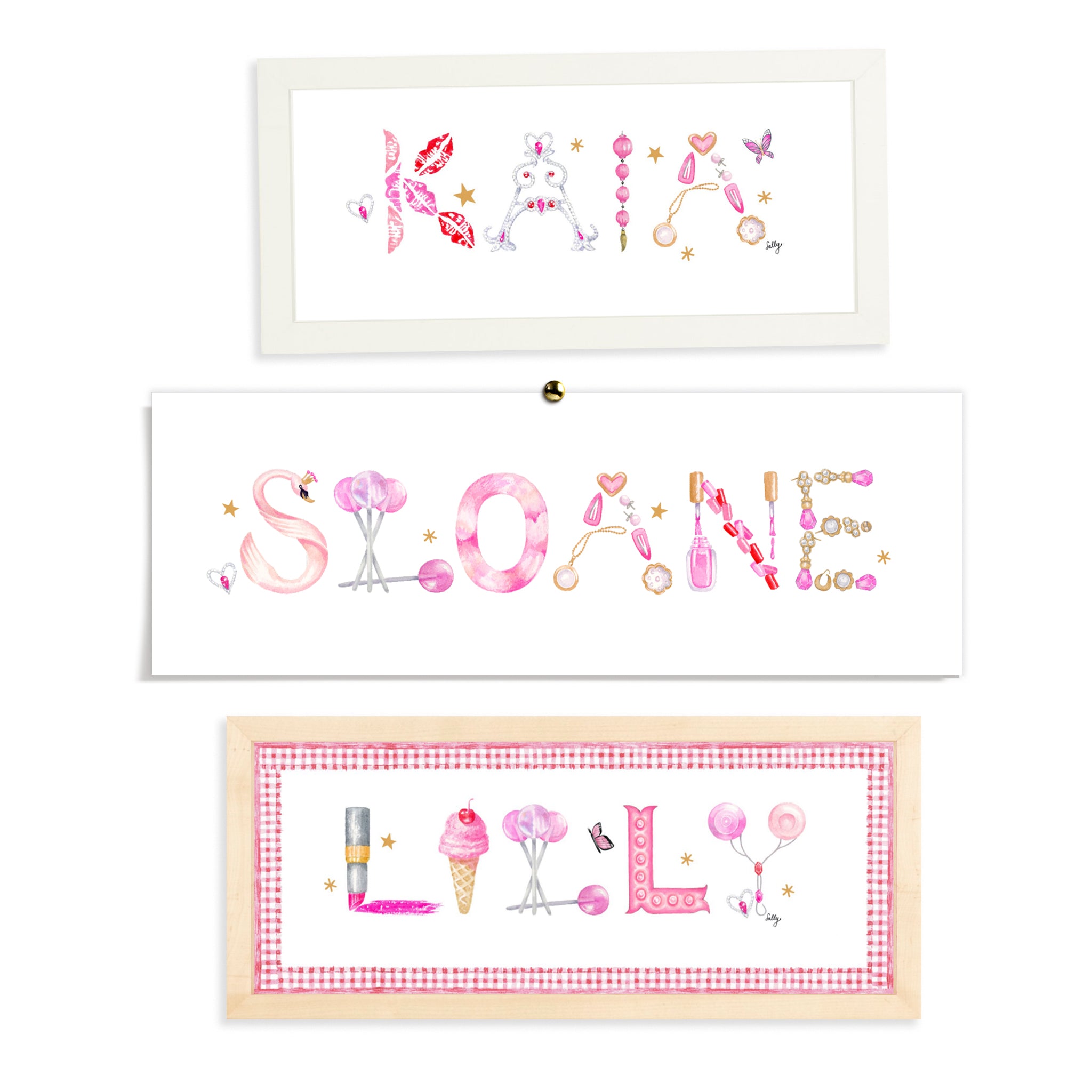 Each letter connects its subject with its letter-sound, lending the artwork an educational aspect. Our Custom Name Prints add individuality to your child’s space, and make for a wonderful baby shower or birthday gift.