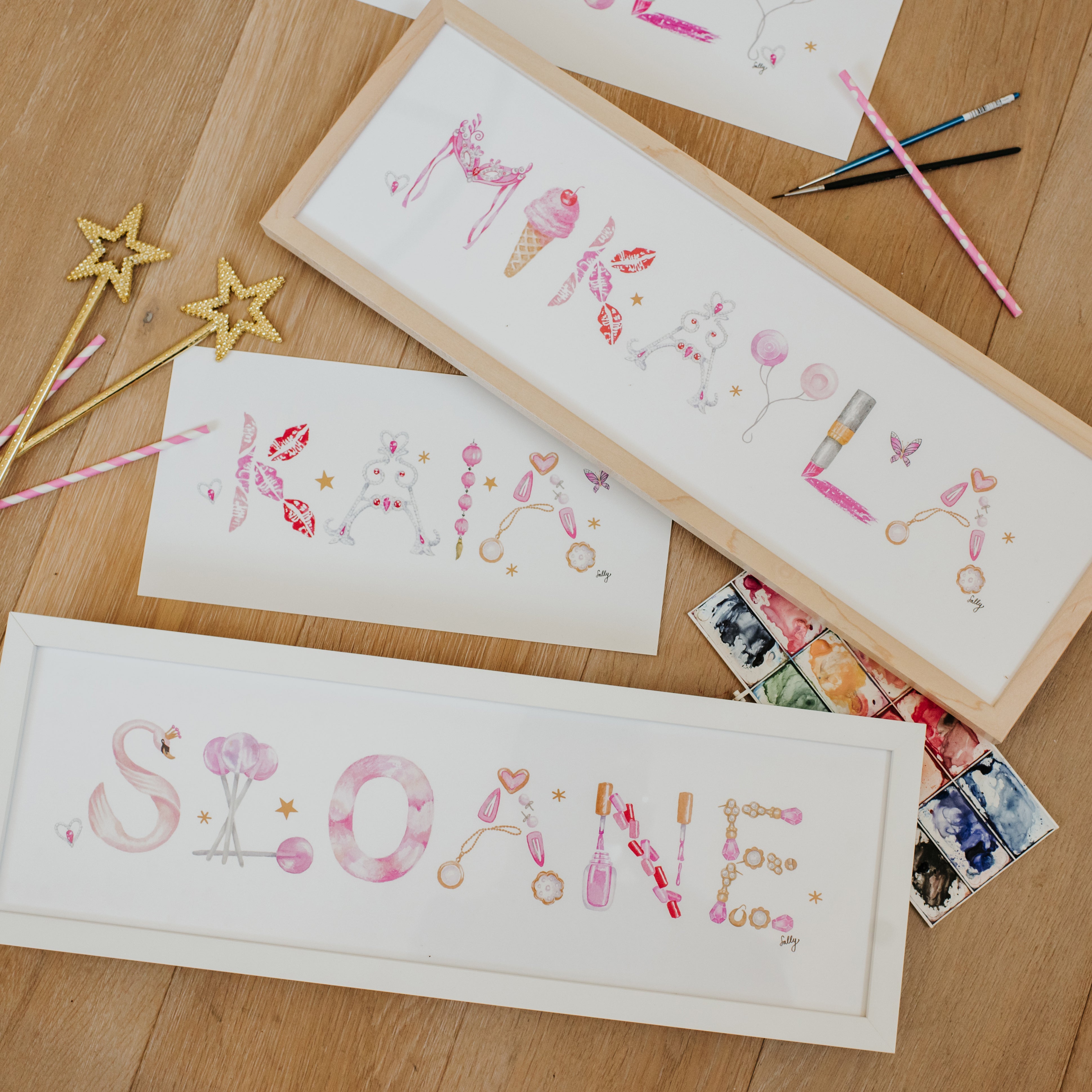 Printed-to-order on white matte paper, based on Sally’s original watercolors. Unframed Name Prints measure 6.5" H with varying width depending on length of name.