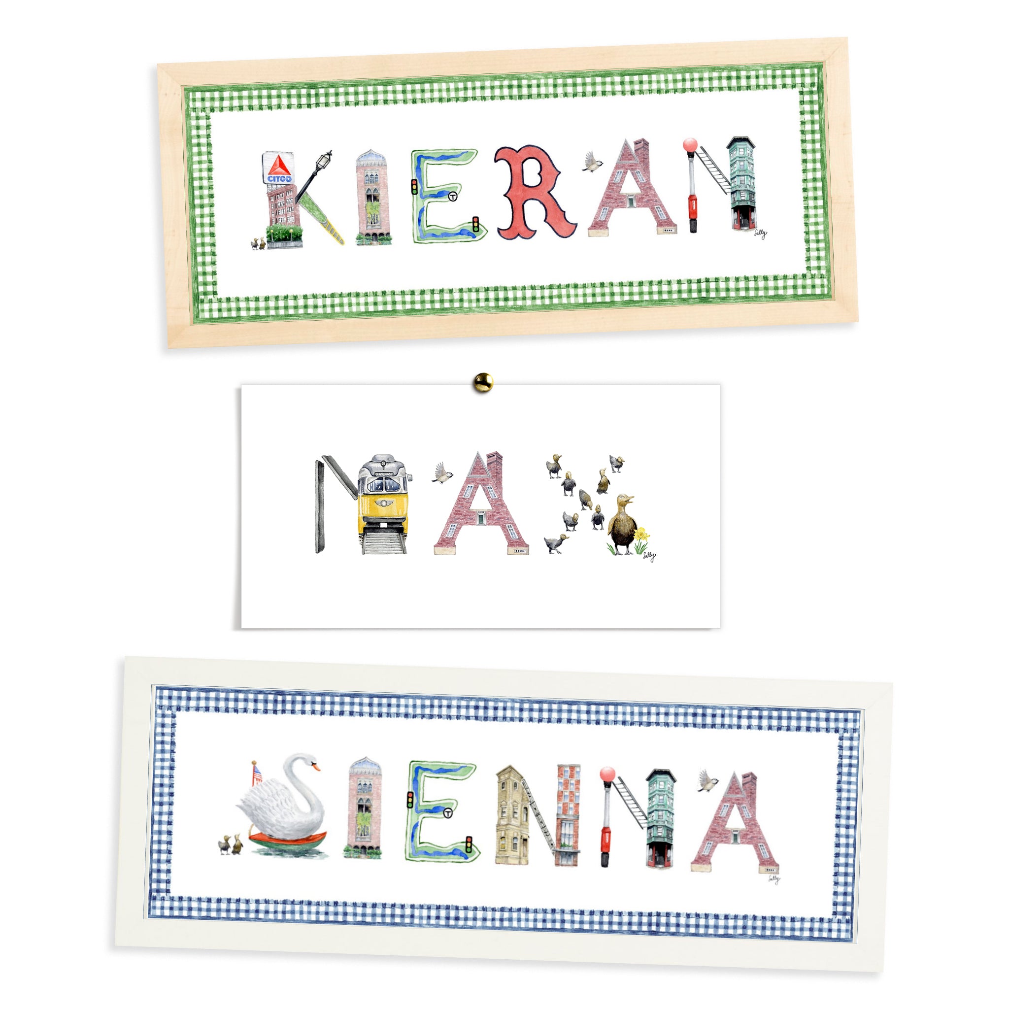 Personalize The Letter Nest’s Boston Alphabet with a Custom Name Print for your nursery, playroom, or kid’s room. You provide the name, and Sally will customize the artwork for you.